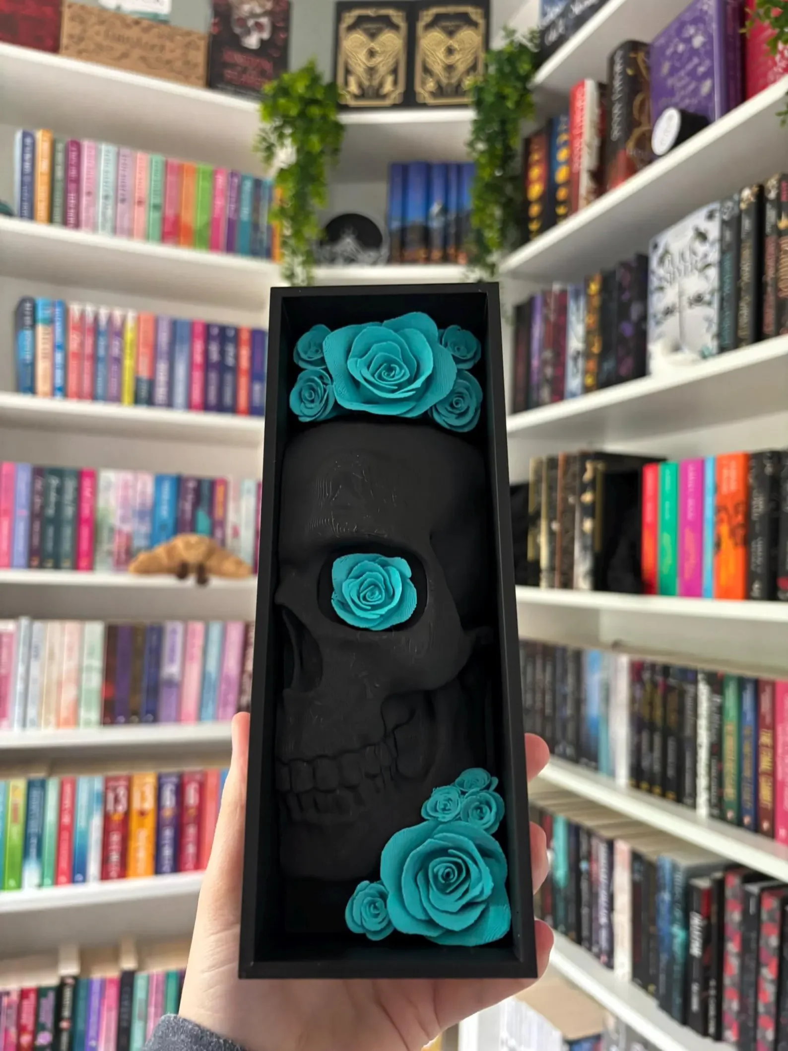 Turn your bookshelf into a darkly beautiful display with this 3D-printed black Half Skull Book Nook Box, featuring a bold half-skull design with a delicate flower nestled in the eye socket. This piece blends macabre charm with haunting elegance—perfect for fans of dark academia, gothic style, and strange & unusual home décor.