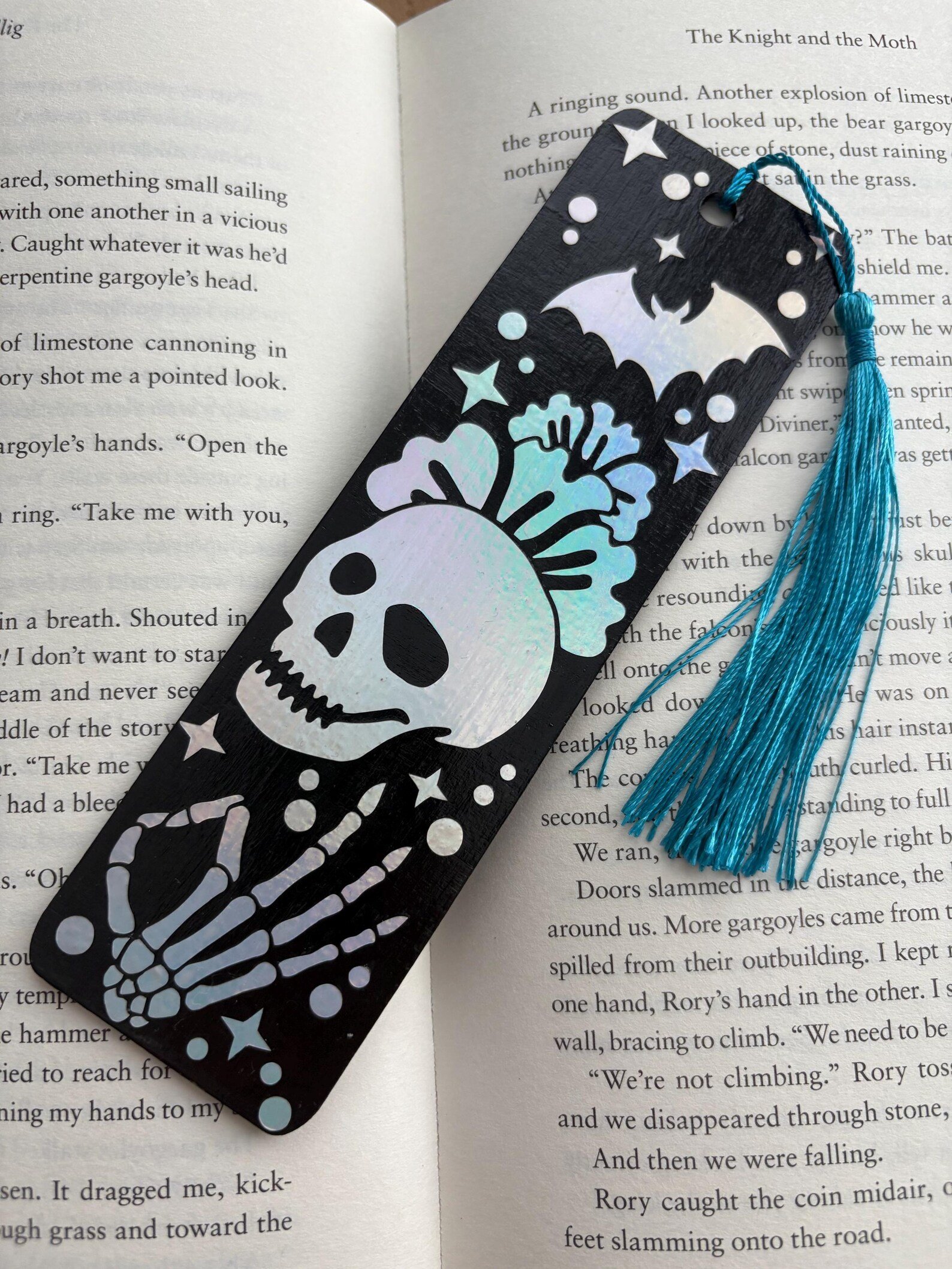 Calling all spooky readers! These bold bookmarks feature a holographic vinyl skull and skeleton hand design, with stars, bats, and a splash of celestial charm.