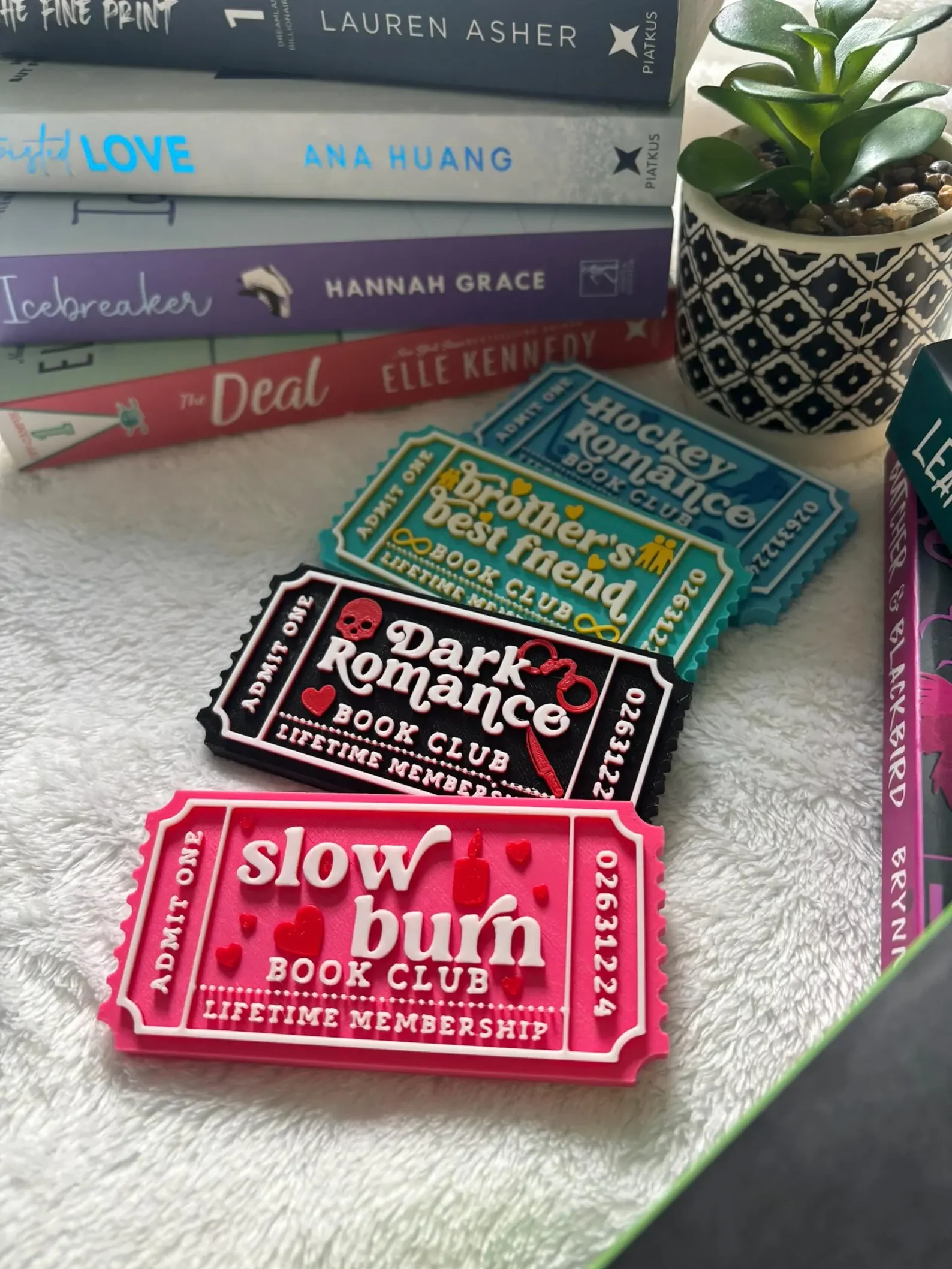 Each ticket is designed with popular romance themes in mind, from the irresistible brother’s best friend to the intensity of dark romance, the anticipation of a slow burn, or the adrenaline of a hockey romance. They’re a fun and creative way to add personality to your bookshelf, desk, or reading nook.